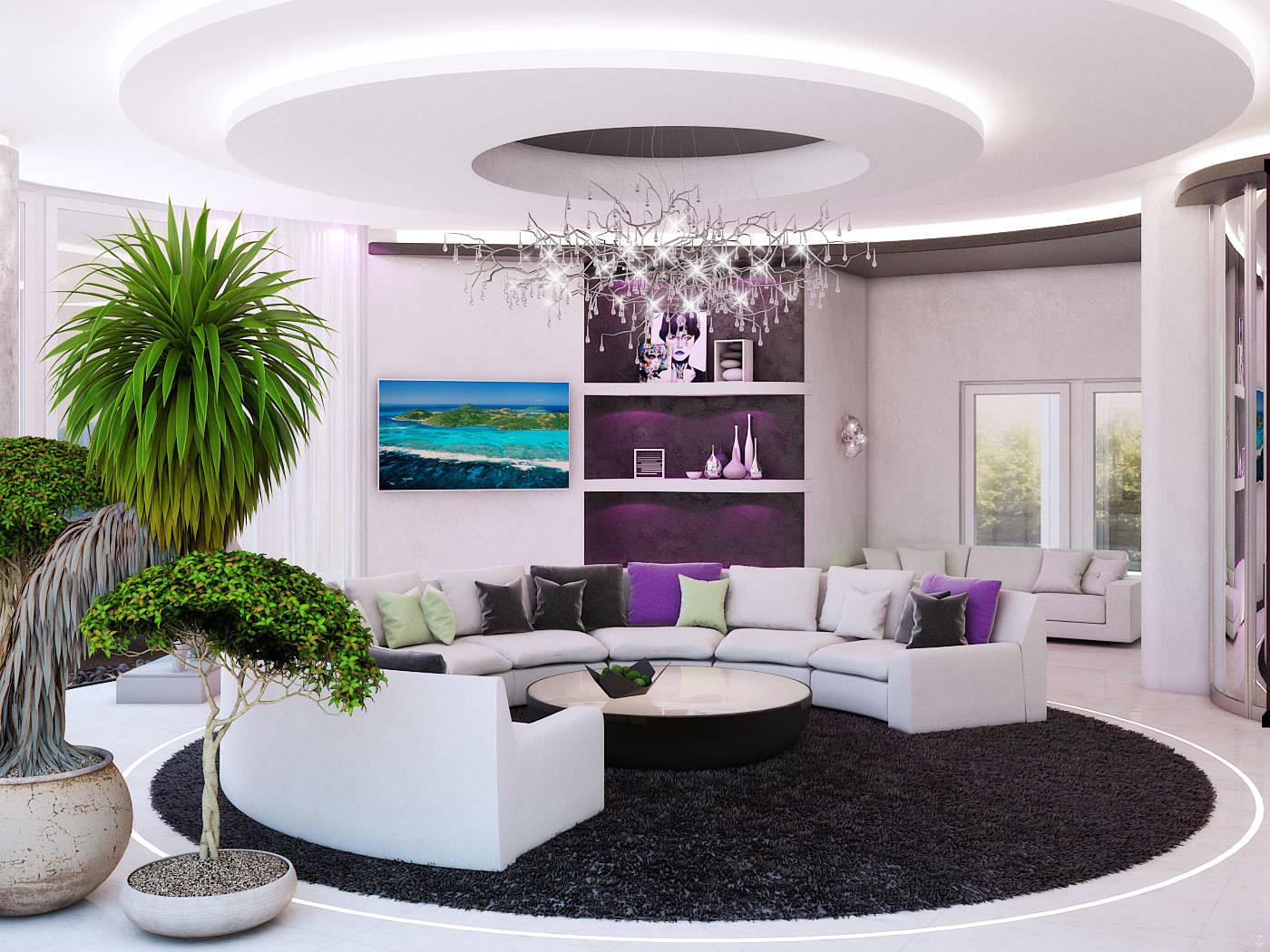 - Das Design des Wohnzimmers in einem modernen Stil - weißer Innenraum, mit reichen ultravioletten Details verdünnt, mit einer weichen Zone in der Mitte.