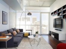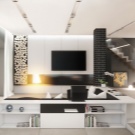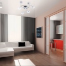 Die Beleuchtung des Wohnzimmers ist ebenfalls wichtig. Anstelle des Hauptlüsters, der traditionell in der Mitte des Raumes platziert ist, ist es besser, alle Arten von LED-Leuchten und die Aufteilung des Raums mit Hilfe von Licht zu bieten. Tischlampen, Wandlampen, Eisleuchten passen harmonisch in den Innenraum, wenn sie auf Herstellbarkeit ausgerichtet sind.Diese Art von Raumgestaltung ist nicht nur für große Flächen verfügbar, sondern auch für Wohnungen mit kleinen Abmessungen.