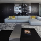 Da High-Tech die Verwendung monochromatischer Farben im Innenraum erfordert, ist es wichtig, die Schirme korrekt zu verwenden, damit sie nicht zu einem monotonen langweiligen Bild verschmelzen, sondern interessanterweise von einem zum anderen wandern. Zum Beispiel ist es besser, eine abgehängte Decke zu machen, indem man einen hellen und dunkleren kontrastierenden Farbton kombiniert, der den Effekt des volumetrischen Raumes schafft. Wenn wir über die Farben der Möbel sprechen, ist alles in etwa gleich. Die Textur des Gewebes sollte ziemlich einfach sein.Es ist besser, keine Polstermöbel mit Druck zu verwenden: das ist wichtig, um den Stil zu erhalten. Wenn Sie einen Bereich hervorheben möchten, kann dies mit einem hellen Farbfleck erfolgen.