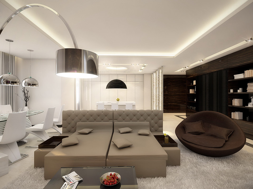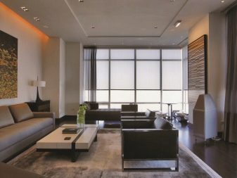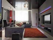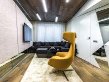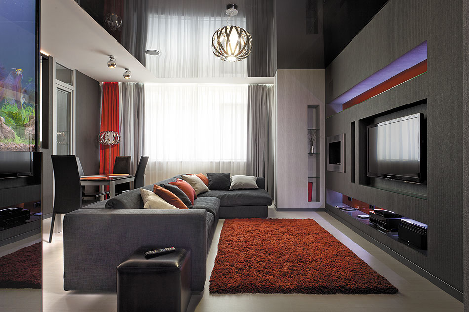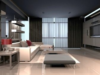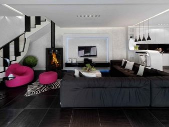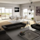 Sobald Sie sich entscheiden, einen stilvollen und modernen Raum zu schaffen, ist es wichtig, die Idee der Stilistik zu bestimmen. Es ist einfacher für Sie, Fotos von Zimmern in diesem Stil zu sehen und wählen Sie selbst, was Sie mögen. Es ist wichtig, von der Decke zu starten. Sie können etwas Universelles und Interessantes schaffen, für das sich Metall-Hängekonstruktionen oder eine Spanndecke eignen, die sich organisch in diese Raumgestaltung einfügt. Die Decke sollte Nischen haben, in denen sich unterschiedliche Beleuchtung befinden wird.