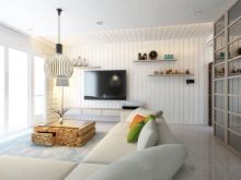 Wandgestaltung beinhaltet keine Zeichnungen, Stuck oder andere Elemente. Die Oberfläche ist oft eben, die Textur ist so glatt wie möglich. Die Farben werden in hellen Farben ausgewählt (weiße, graue oder beige Farbtöne der Palette). So können Sie den Raum erweitern, optisch luftig machen. Die beliebtesten Oberflächen sind einfache Tapeten oder Farben. Wenn Sie sich entscheiden, die Wände zu streichen, können Sie zwischen glänzenden und matten Optionen wählen.