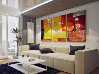 Wer den Innenraum lebendig und saftig machen will, sollte besser Gemälde verwenden.Dies können ein oder mehrere Bilder sein, die eine Fortsetzung von einander sind. Diese Rezeption wird ein heller Akzent im Raum sein. Die Verwendung von farbigen Textilien in Form von Kissen auf dem Sofa, passend zum Teppich in der Nähe der Möbel, schafft einen besonderen Komfort im Raum.