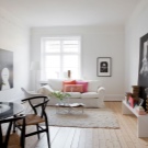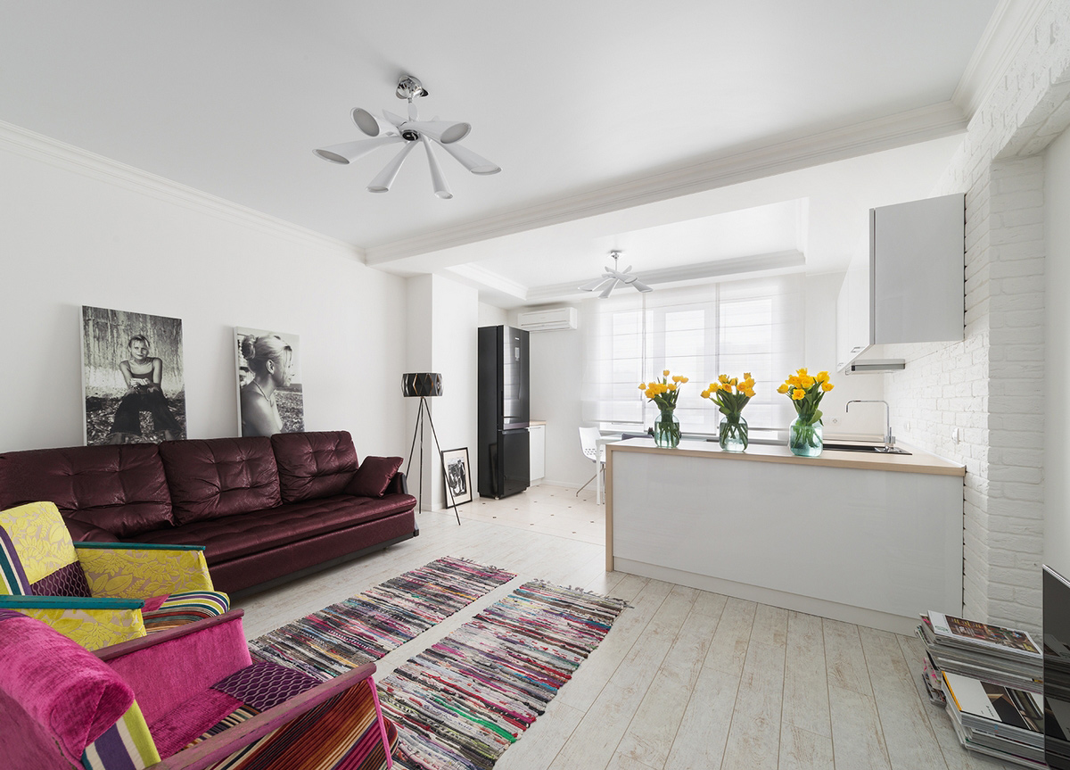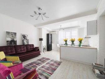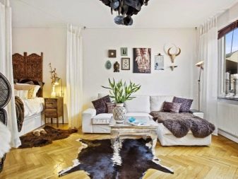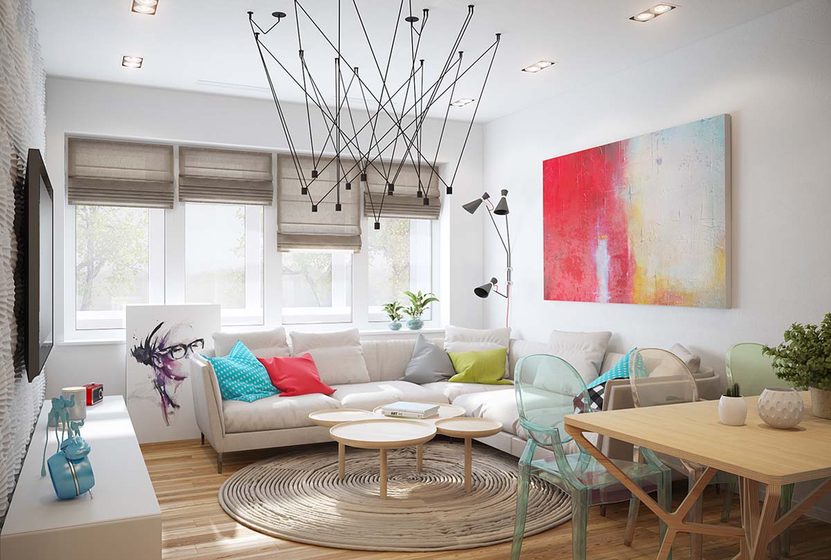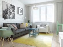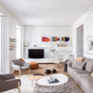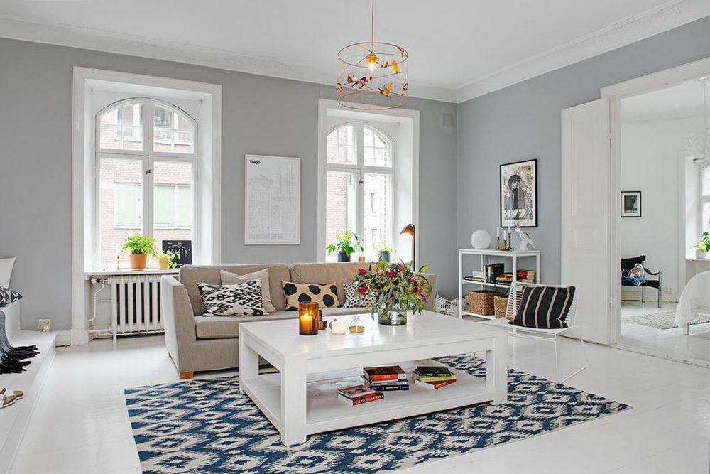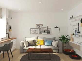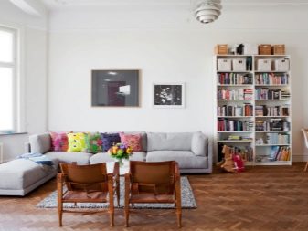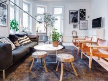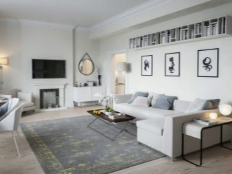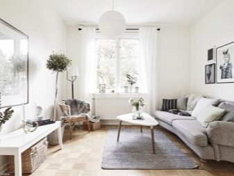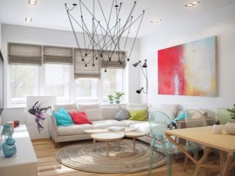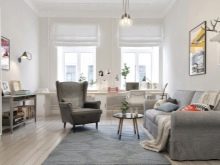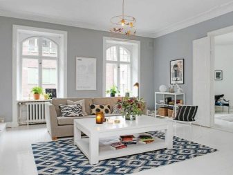 Wir können sagen, dass das skandinavische Interieur monochrom ist, deshalb braucht es unaufdringliche Akzente: kleine Schmuckstücke, helle Kissen auf der Couch, bunte Blumentöpfe, Teppiche mit vielfarbigem Aufdruck im Essbereich.