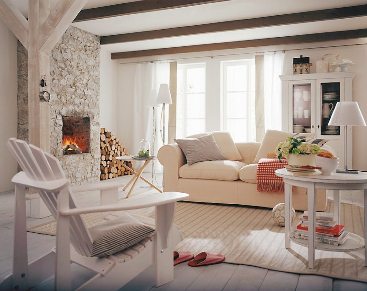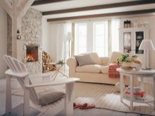 Das Wohnzimmer in diesem Stil ist geräumig, hell und gemütlich, es ist angenehm, abends im Winter kaltes Wetter zu verbringen, in eine Decke gehüllt, und im heißen Sommer wird es Kühle und Frische bieten.