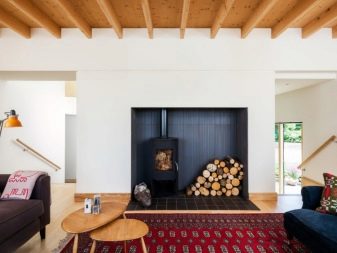 Bei der Gestaltung eines Wohnzimmers mit skandinavischen Motiven bevorzugen Designer die Verwendung von Uni-Weiß, um die Deckenfläche zu streichen, oder die Decke mit weißem Acryl. Mehrstufige Strukturen werden hier nicht verwendet, aber wenn es scheint, dass die Decke zu primitiv aussieht, können Sie sie mit Holzbalken dekorieren.