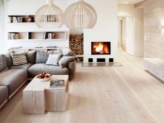Der Bodenbelag sollte natürlich sein, so dass das Parkett meistens aus hellem Holz von Milch- und Sandfarbe besteht: Birke, gebleichte Eiche, Ahorn, Hainbuche.Wenn Ihnen das Parkett zu teuer erscheint, ist eine Laminatplatte mit weißem oder hellbraunem Farbton die beste Alternative.