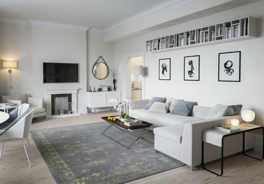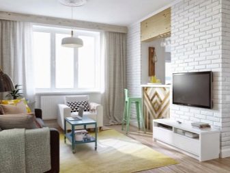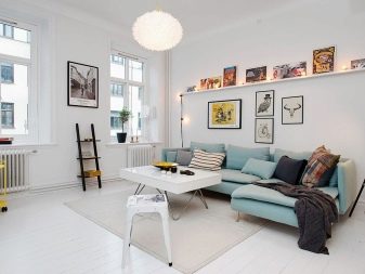 Kohler aus den skandinavischen Ländern selbst - blasses und weiches Licht, das vom Schnee reflektiert wird, es weht aus der Kühle, das gleiche Spektrum wurde vom gleichnamigen Interior Style übernommen. Dank dieser Farbgebung wird das Wohnzimmer optisch geräumiger und größer. Haben Sie keine Angst, dass das Innere kalt und unwirtlich aussehen wird.