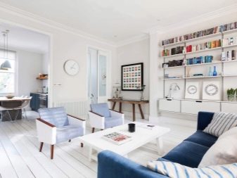 Fenster und Türen sind übrigens ebenfalls mit weißer Farbe gestrichen. Diese Elemente erfüllen nur ihre funktionalen Aufgaben im Innenraum und sollten sich nicht vom allgemeinen Stil des Raumes abheben.