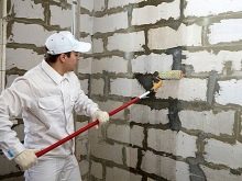 Acrylprimer-Gemische mit einer tiefen Eindringtiefe sollten in besonderer Weise aufgebracht werden, nachdem zuvor die Oberfläche auf Risse oder Risse untersucht wurde. Im Falle der Feststellung von zu großen Löchern, deren Durchmesser eineinhalb Millimeter übersteigt, ist es wünschenswert, sie mit einem Kitt abzudichten, da sie nicht nur den Verbrauch der Lösung erhöhen, sondern auch die dampfdurchlässigen Eigenschaften der Basis beeinträchtigen. Nach der Überprüfung wird empfohlen, die Wand sofort von Rostspuren zu reinigen, da bei einem hohen Säuregehalt der Zusammensetzung selbst ein geringer Prozentsatz von Rost eine unnötige chemische Reaktion verursachen kann.