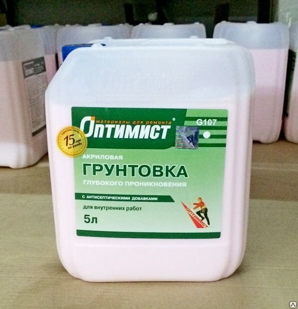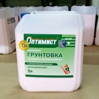 Die Zusammensetzung "Optimist" ist eine Mischung mit antiseptischen Zusätzen. Erhältlich in Banken mit einem Volumen von 10 Litern zu einem Preis von 600 Rubel, die sehr demokratisch ist. Der Verbrauch beträgt 150-250 ml / m2. Anwendungstemperatur - von 5 bis 35 Grad.Die Zusammensetzung trocknet in zwei Stunden, was die Reparaturdauer verkürzt. Zu den Vorteilen der Grundierung gehört die Verhinderung von Schimmel. Der einzige Nachteil dieser Mischung ist ein unangenehmer Geruch.