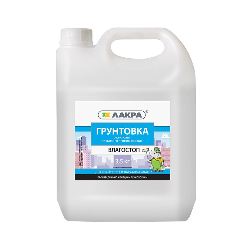 Lacra Acrylbodenmischung ist auch in 10 Litern Kapazität erhältlich.aber es kostet 1000 Rubel. Die Durchflussrate variiert von 50 bis 100 g / m2, dringt in die Lösung bis zu einer Tiefe von 1-5 Millimetern ein. Die Grundierung trocknet innerhalb von 3 Stunden. Die Mischung hat keinen giftigen Geruch.