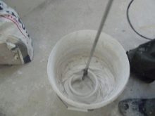 - Vor Beginn der Arbeiten wird empfohlen, die Lösung gründlich mit einem Baumischer oder einer elektrischen Bohrmaschine mit einem Paddelaufsatz zu mischen. Dies muss getan werden, um Quarzsandpartikel gleichmäßig über das Volumen der Mischung zu verteilen.