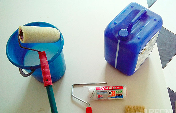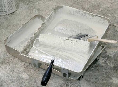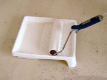 Die fertige Grundierung muss in einem speziellen Gefäß auf das gewünschte Niveau gegossen werden. Schütten Sie nicht die volle Kapazität aus, sonst besteht die Gefahr, dass Sie verschüttet werden. Rühre die Mischung gründlich vor dem Grundieren, auch wenn sie homogen erscheint. In diesem Behälter sollten Sie die Bürste oder Rolle gleichmäßig befeuchten, damit die weichen Elemente der Werkzeuge gut durchnässt werden.