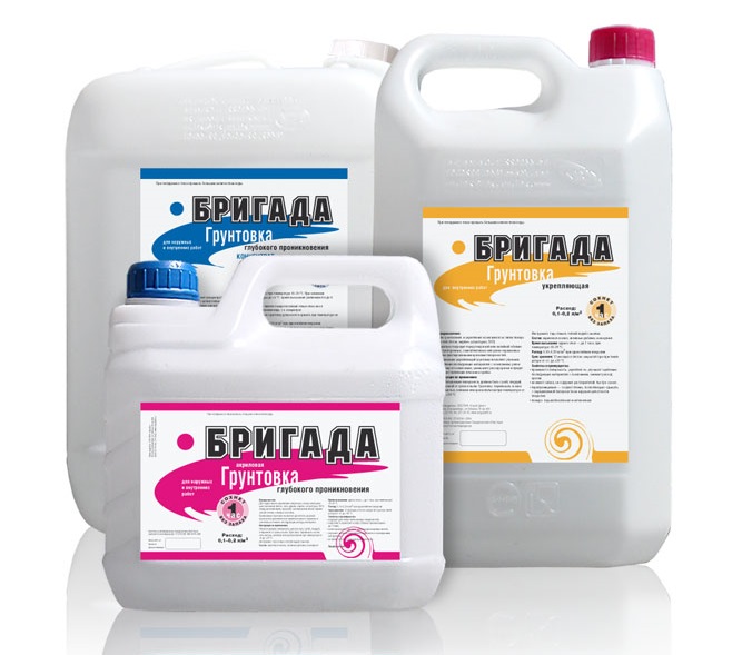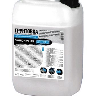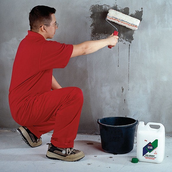 Die Grundierung wird ebenfalls in Abhängigkeit von dem Zustand der Oberfläche ausgewählt. Wenn die Wände in einem positiven Zustand sind und keine zusätzliche Verstärkung erforderlich ist, kann verstärkender Boden für die Behandlung verwendet werden. Es ermöglicht Ihnen, Staub von der Oberfläche zu entfernen und die Deckschicht gut zu fixieren. Außerdem bildet diese Zusammensetzung einen Schutzfilm.