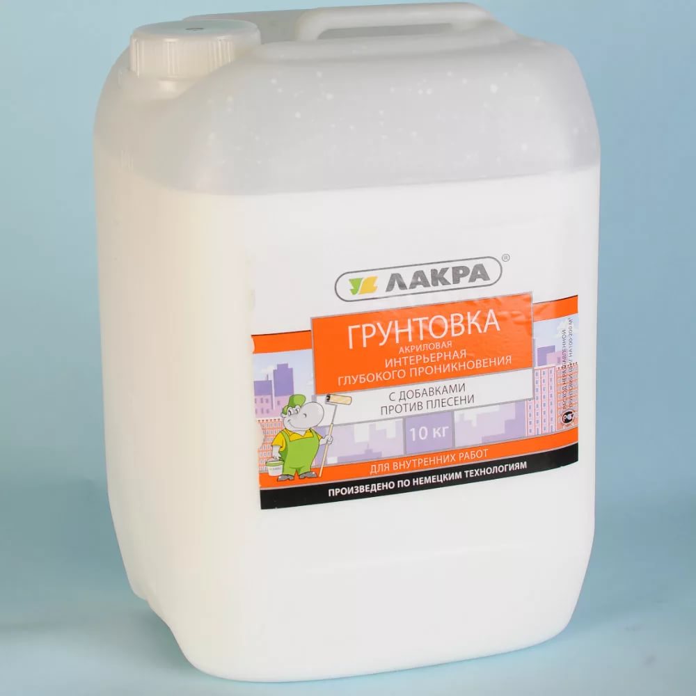 Tief eindringende Basis ist eine wasserlösliche Zusammensetzung, die Latex-Mischung und Acrylfarbe enthält. Der Schutzfilm, der auf der Oberfläche gebildet wird, stößt Wasser ab, hilft, die Kälte zu überleben, und taut dann auf. Antifungizid schützt den Beton vor Schimmel und Schimmel. Aber zur gleichen Zeit Die Grundierung verstopft die Poren der Wände nicht, deshalb zirkuliert die Luft normal.