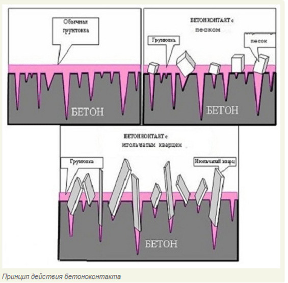 Diese Grundierung ist in Gegenwart von Quarzsand interessant. Aus diesem Grund wird die Oberfläche nach dem Trocknen rauh. Diese Zusammensetzung wird auf den Untergründen mit alter Farbe, auf Beton oder sogar Fliesen verwendet. Da die alte Beschichtung aufgrund ihrer Ebenheit und Glätte nicht zu einer ausreichenden Haftung beiträgt, besteht die Aufgabe des Bodens darin, die notwendige Grundlage zu schaffen, auf der der Putz haften bleibt. Es ist für schwach absorbierende Wände gedacht. Es ist eine Suspension der kleinsten Sandkörner in einer klebrigen Masse von rosa Farbton. Auf der Oberfläche des Gitters wie Sandpapier gebildet, ist es ziemlich rauh.