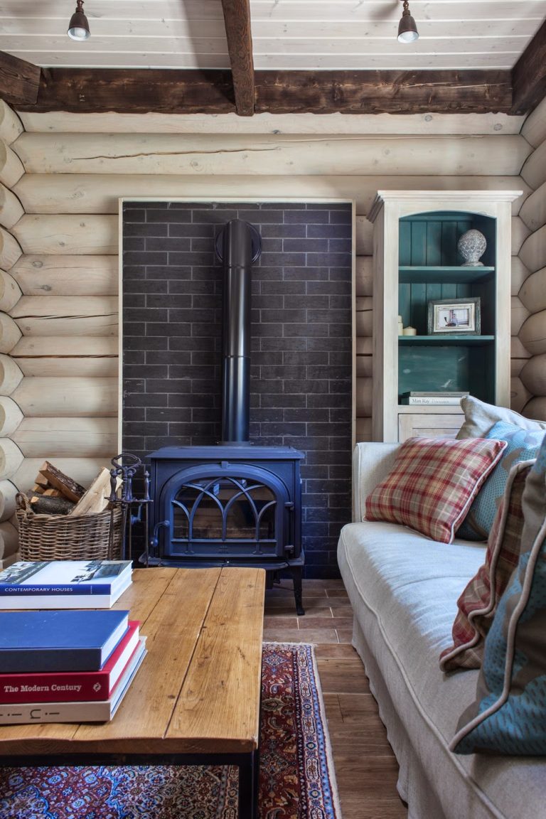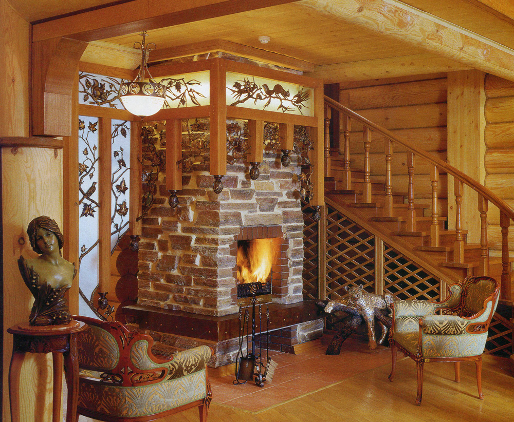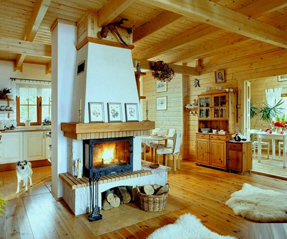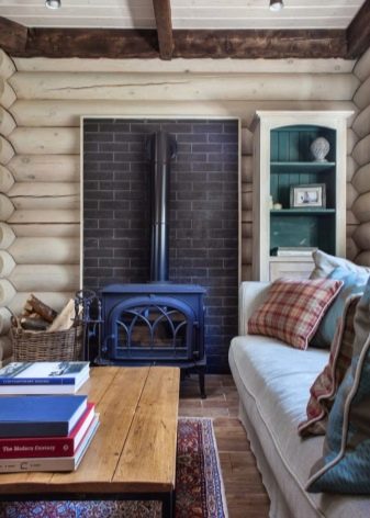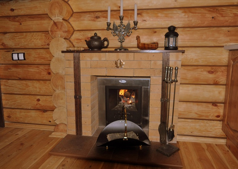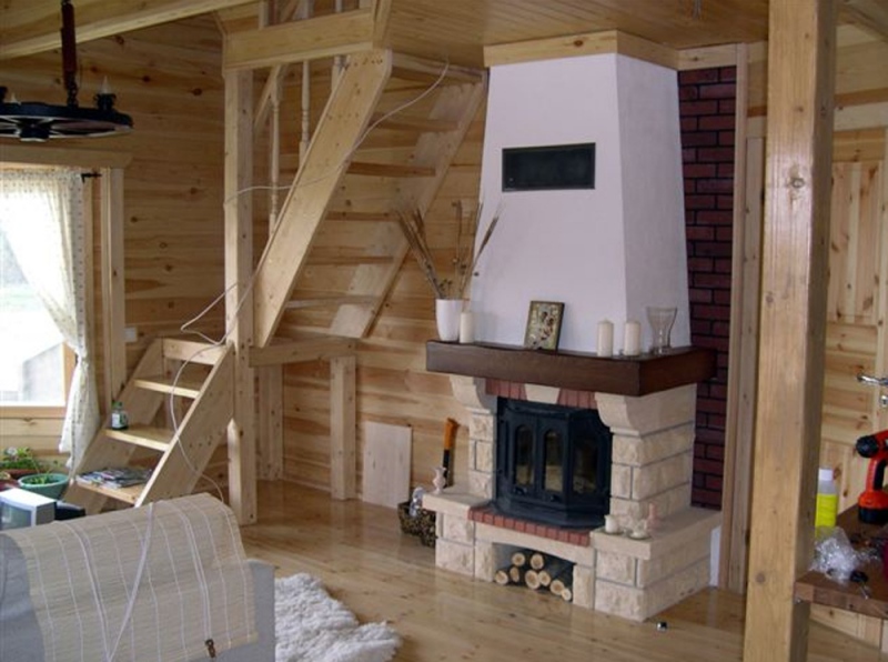 - Dekorativer Kamin fügt sich harmonisch in jedes Interieur eines Holzhauses ein.