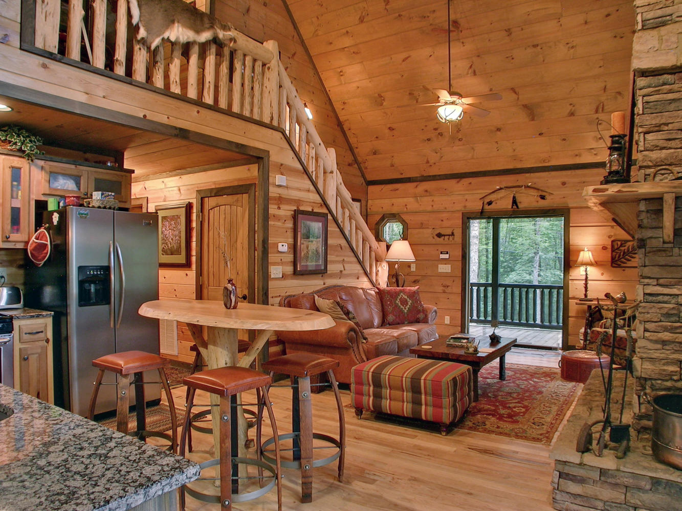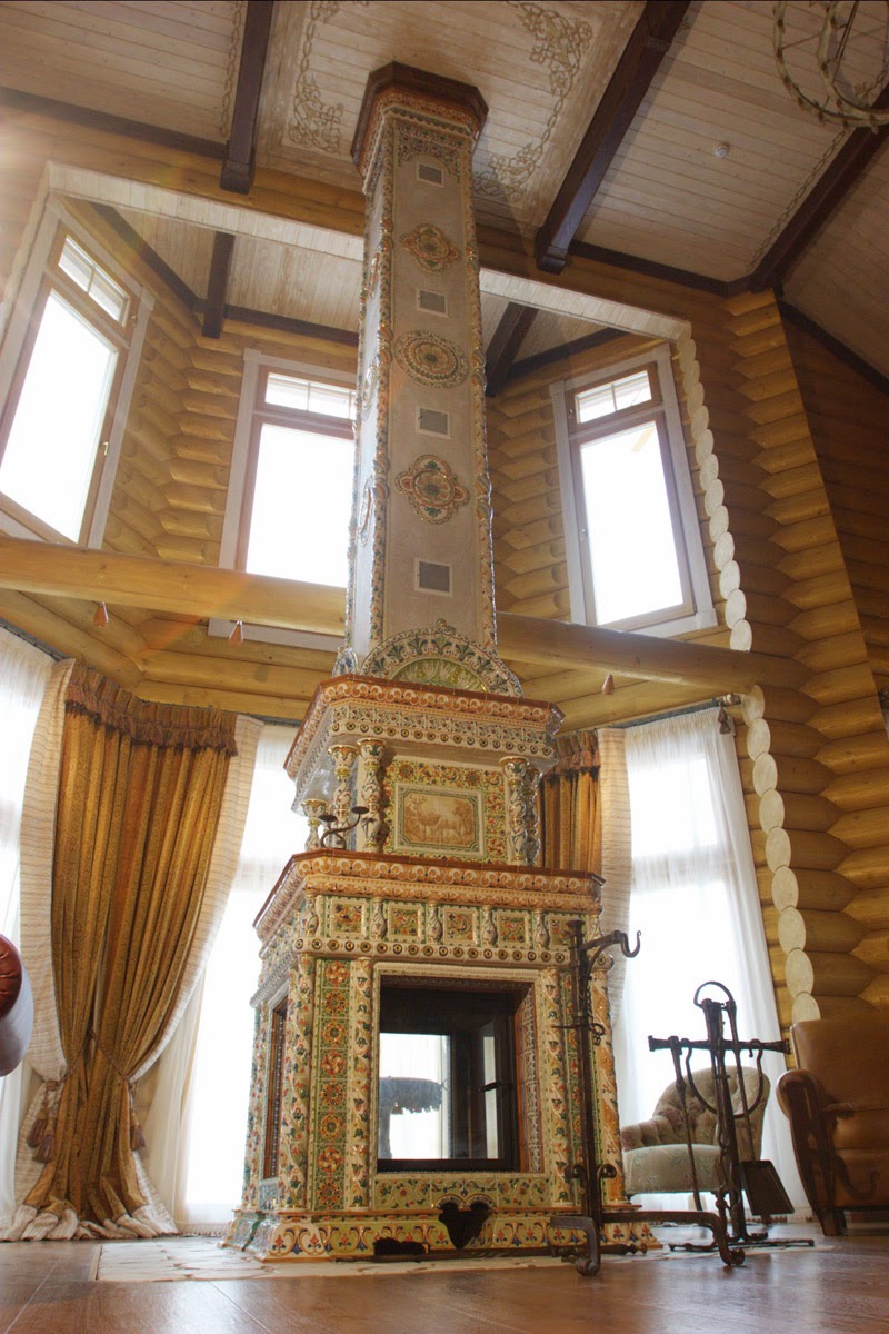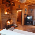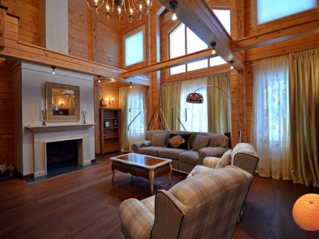 - Ein Kamin aus feuerfesten Fliesen, verziert mit einem Muster, passt perfekt in das geräumige Wohnzimmer eines Holzhauses. Dunkelbraune Möbel aus echtem Leder - ein Sofa und zwei Sessel, die sich perfekt mit Stoffstühlen ergänzen. Zwei große Puffs, Luftschleier an den Fenstern, offene Regale und ein großer Kronleuchter ergänzen das klassische und gemütliche Wohnzimmer.