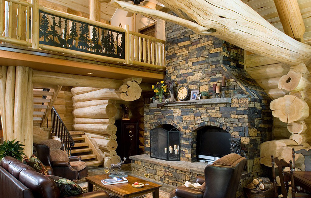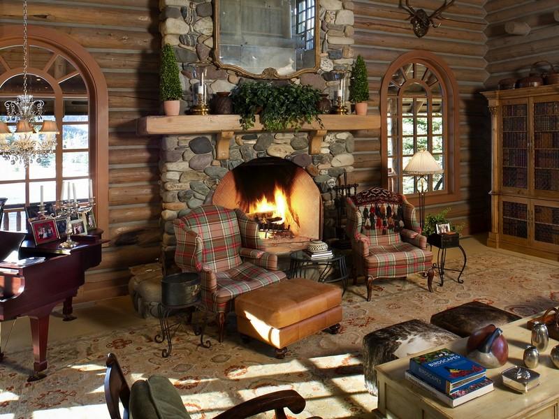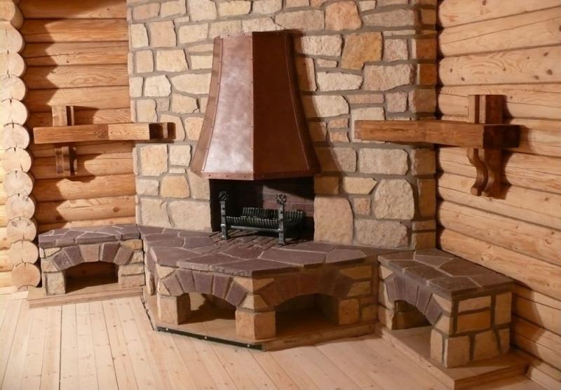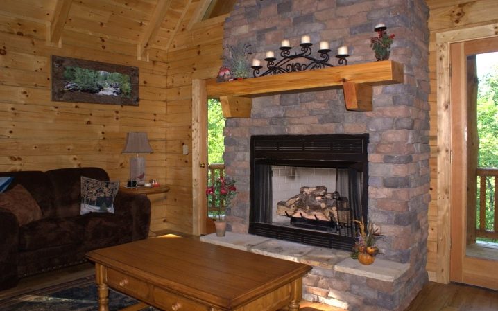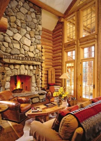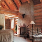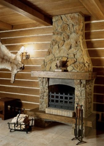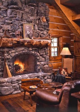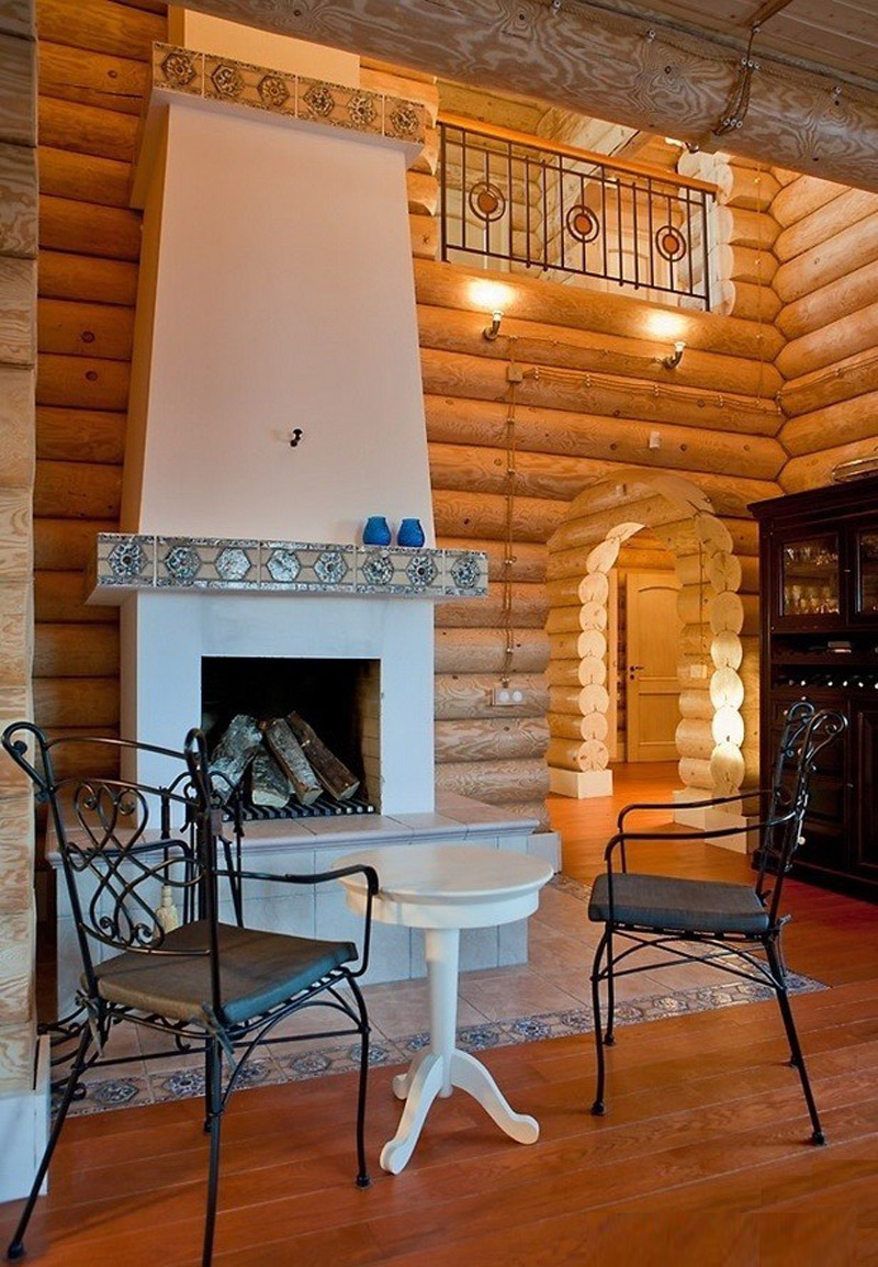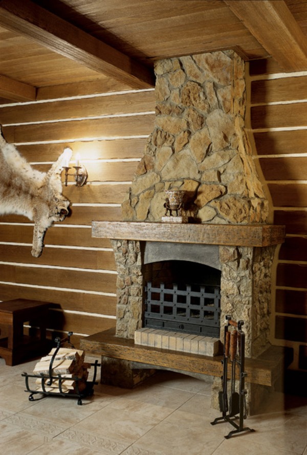 Kamin in Blockhütten, Wandstrukturen - die beliebtesten Lösungen in Holzhäusern.