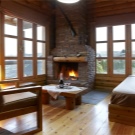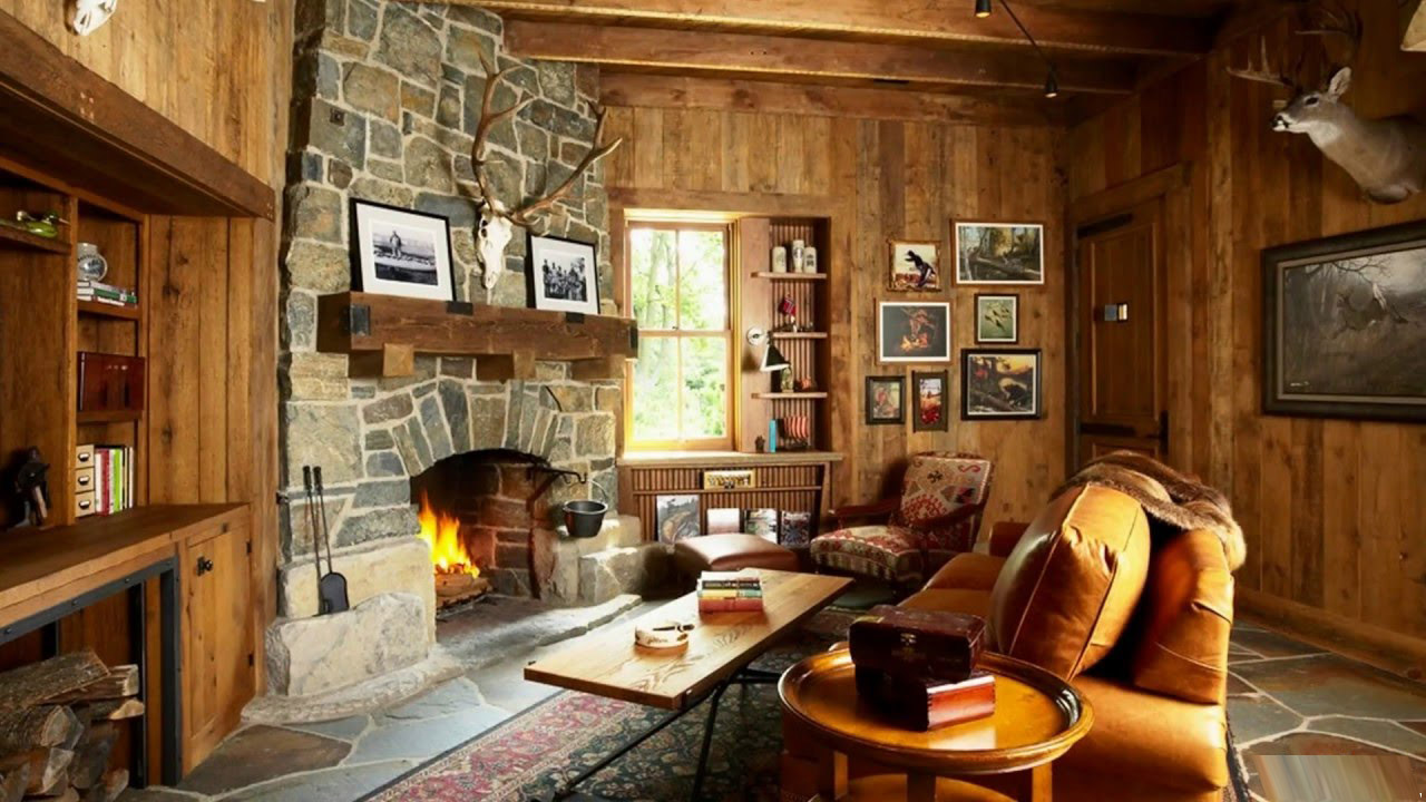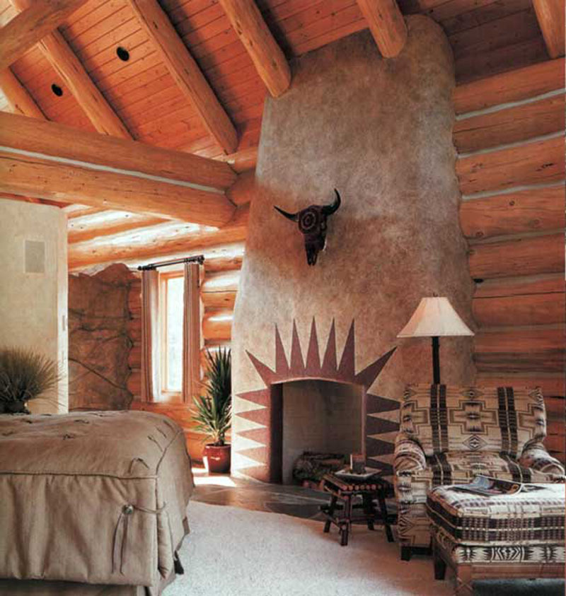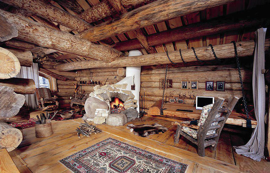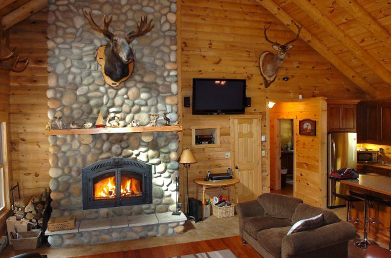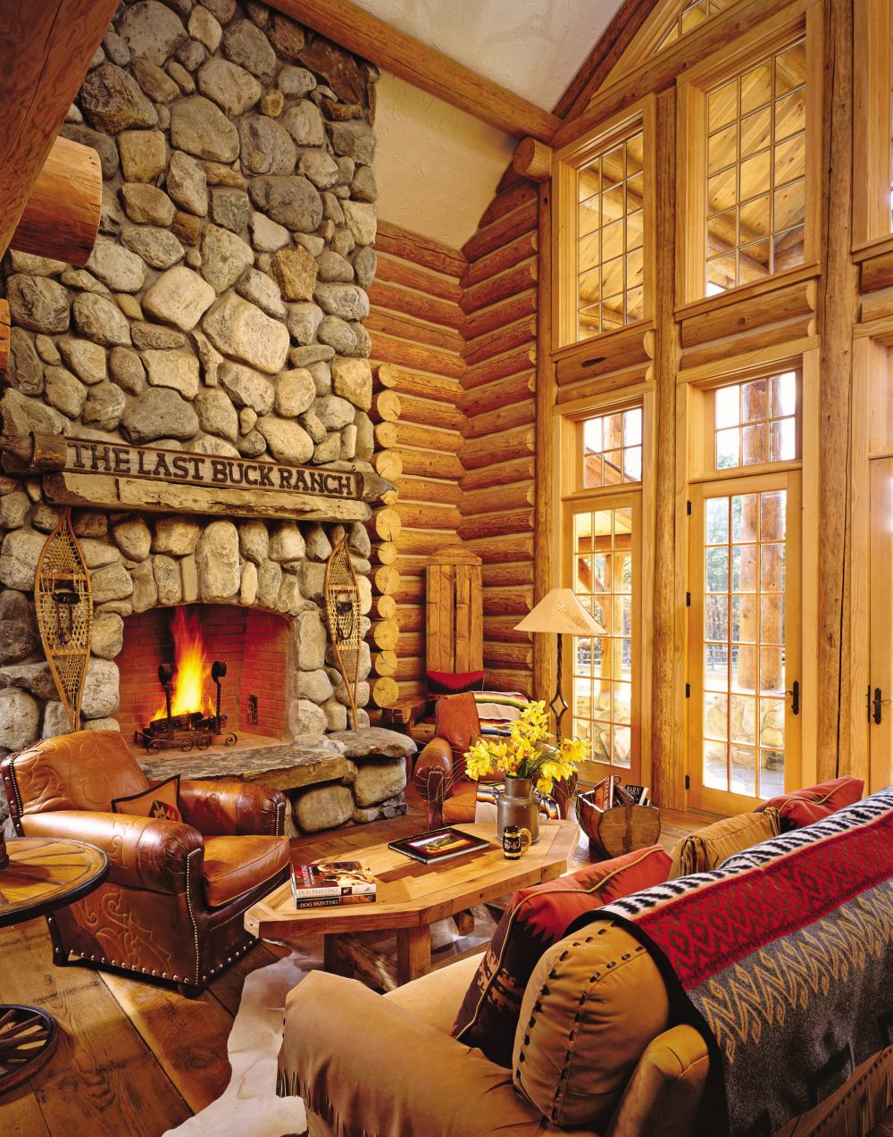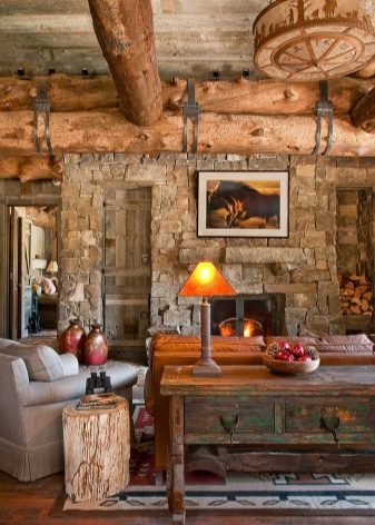 Kamin in Blockhütten, Wandstrukturen - die beliebtesten Lösungen in Holzhäusern.