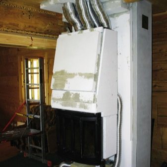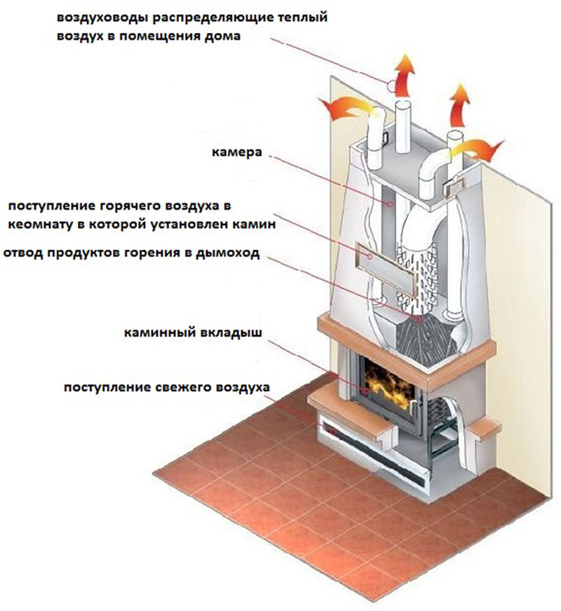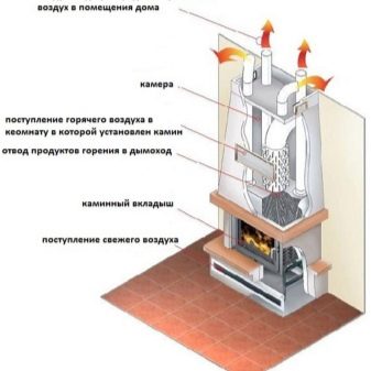 Wenn die Heizung des Kamins Luft oder Wasser ist, besteht die Konstruktion aus einem Kanal zur Verteilung von warmer Luft, einem Kaminrohr, Gittern für den Austritt von erwärmter Luft, einem Gehäuse, einem Wassermantel und einer geschlossenen Feuerkammer.