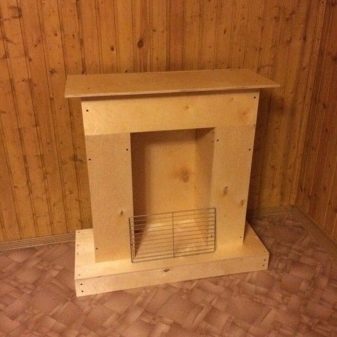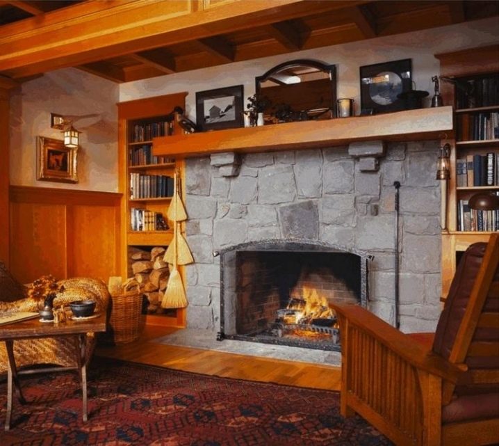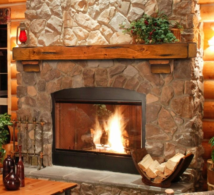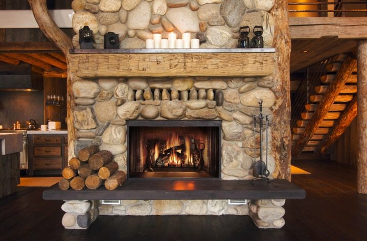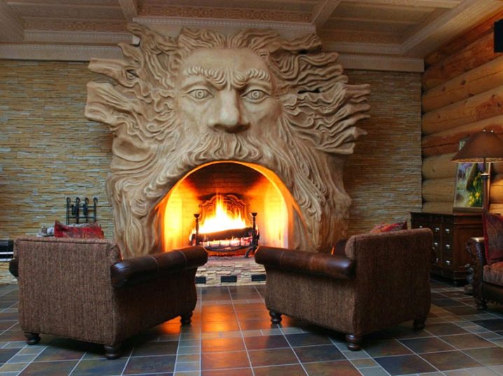 Das Design kann mit Fliesen, geschnitzten Verzierungen, einem breiten Regal sein. In der Hütte ist es angebracht, wie echte Kamine auszusehen, und dekorative aus Gipskarton, wenn es eine Zentralheizung gibt.