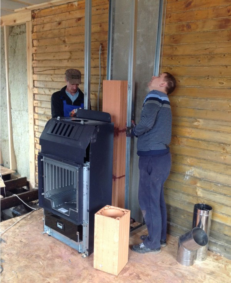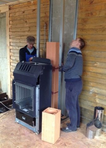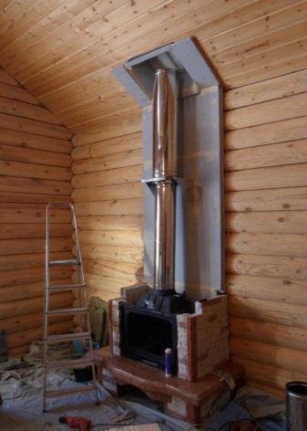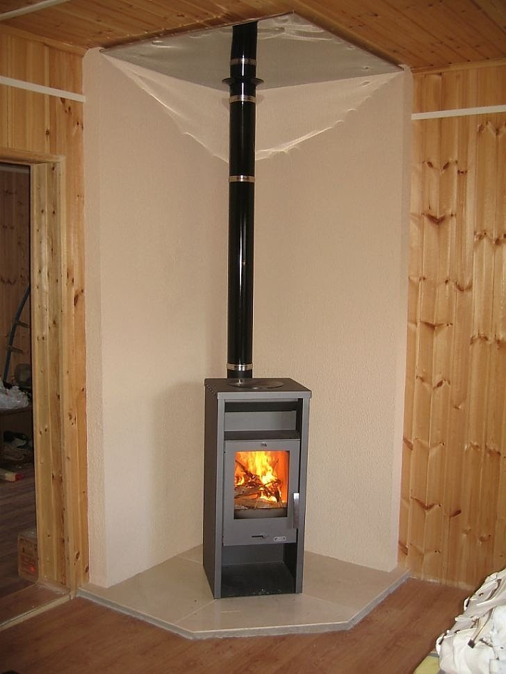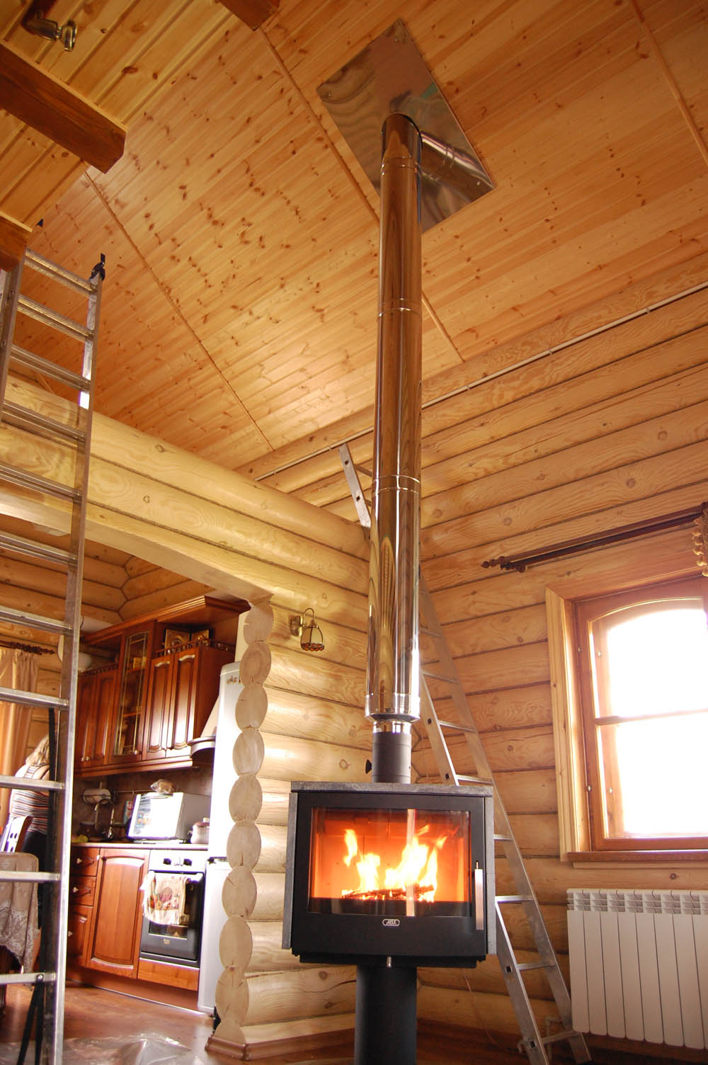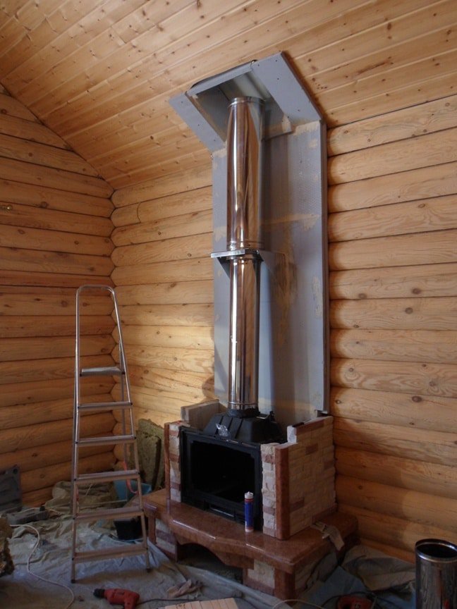 Wenn das Haus aus Baumstämmen oder Bauholz besteht, denken Sie daran, dass sich dieses Material leicht entzünden wird. Die Installationsreihenfolge ist wie folgt: Fundament, Gehäusewand, Schornstein. Kamine werden nach Aufstellungsort klassifiziert.