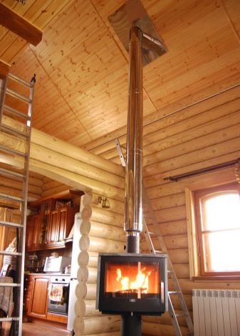 Schön und passend im Holzhaus sieht der Ofenkamin aus. Dies ist eine Kombination aus einem Ofen und einem Kamin. Solche Konstruktionen sind aus Metall oder Talkum hergestellt. Die Vorteile des Ofens sind einfache Installation, fehlendes Fundament, geringes Gewicht, niedriger Preis, große Auswahl an Design und Leistung.