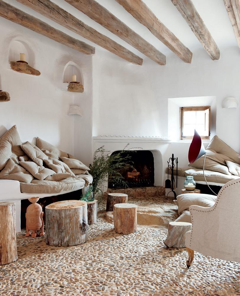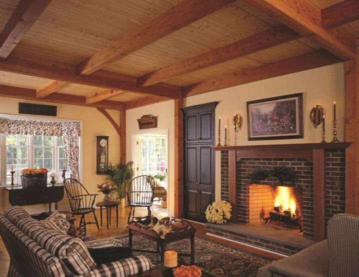 Ein weiterer wichtiger Bestandteil des Kamins ist der Schornstein. Seine Konstruktion hat seine eigenen Eigenschaften: in der Decke wird ein Loch für ein Rohr gemacht, der Abstand zwischen dem Schornstein und der Decke ist mit einem feuerfesten Material und einem Metallblech ausgelegt. Wenn der Kamin im Wohnzimmer installiert ist, kann das Design imitierte Balken an der Decke unterstützen. Der Holzbalken auf die individuelle Größe wird das Interieur dekorieren und dem Raum eine besondere Note verleihen.