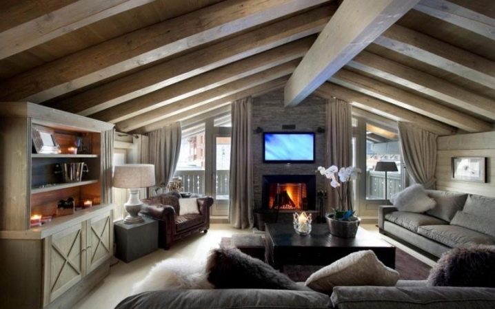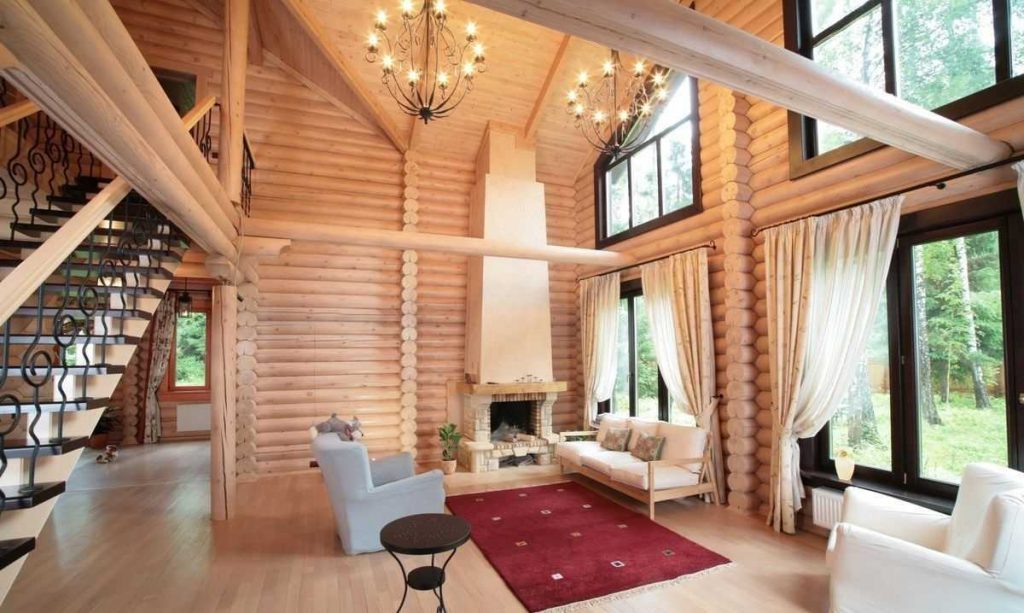 Der Balken kann auch eine dekorative Rolle im Innenraum spielen und den Raum in zwei Zonen teilen - Ruhe neben dem Kamin und aktiver Zeitvertreib.