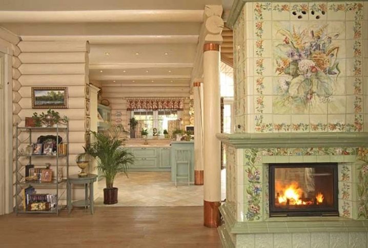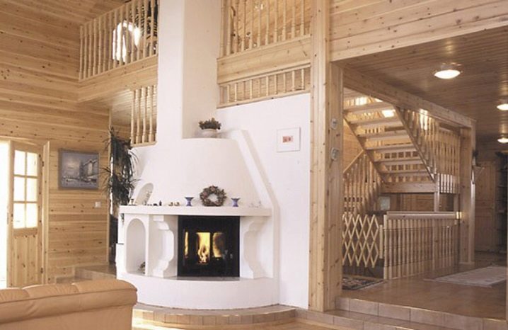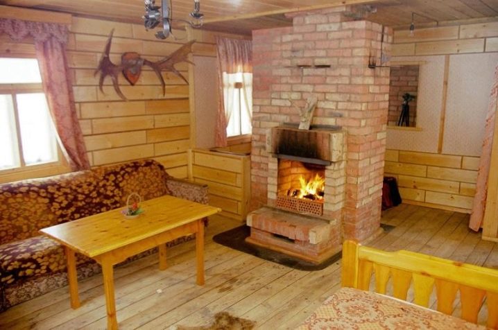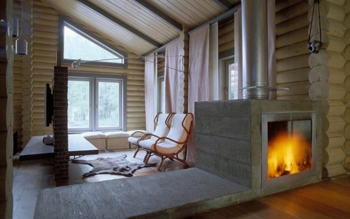 Ein Kamin in einem Holzhaus - ein heller und harmonischer Akzent, das zentrale Objekt des Wohn- oder Schlafzimmers. Oft erhitzt eine solche Struktur das ganze Haus, schafft eine gemütliche und warme Atmosphäre.