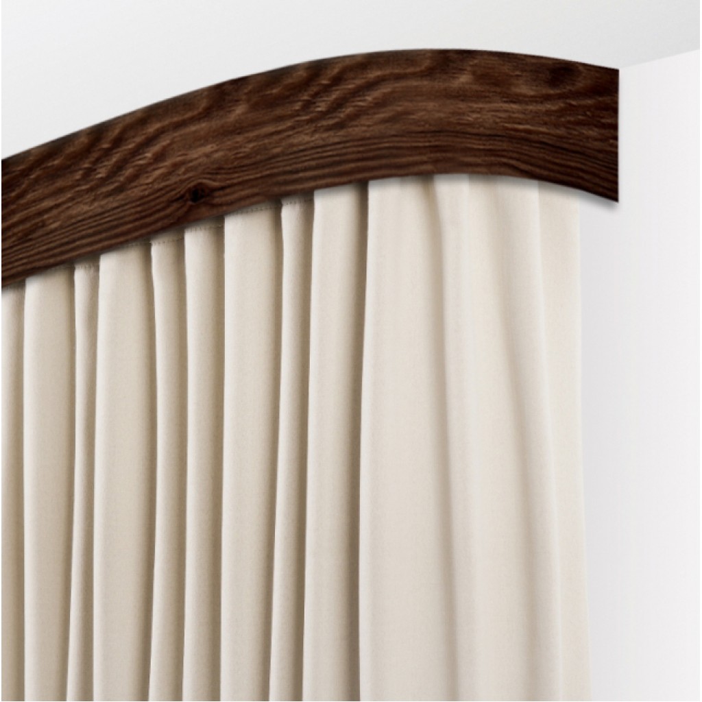- Runde. Oft für Vorhänge mit Ösen oder Ringen als Aufsatz gewählt. Ergänzt durch eine kleine Konsole. Vorhang Mini-Gesims näher am Fenster gelegen.