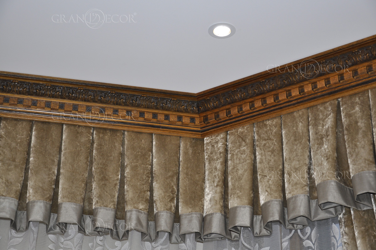 Normalerweise wird der Halter für Vorhänge mit Halterungen und Spitzen geliefert, aber Sie können Ihre eigenen Traufe montieren, anstatt ein Standard-Kit zu kaufen. Dieses Modell wird ein wenig teurer, aber es wird definitiv exklusiv sein. Denken Sie jedoch an die Moderation. Zu phantasievolle Gesims im Budget-Interieur wird unangemessen erscheinen. Dasselbe gilt für die umgekehrten Fälle, in denen sich die Mieter dafür entscheiden, nur die Fensterdekoration zu sparen.