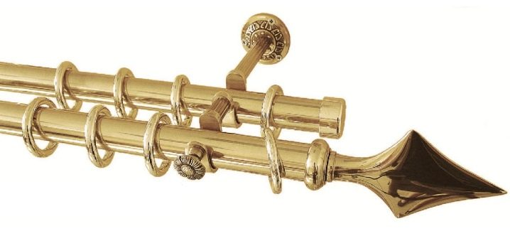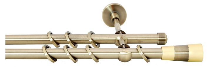 Zweireihige Gesimse gehören bis heute zu den beliebtesten. Dies ist weitgehend darauf zurückzuführen, dass diese Option viele der Mängel der anderen Modelle nicht aufweist. Im Gegensatz zu einreihigen oder dreireihigen Modellen hat der Doppelhalter für Vorhänge eine optimale Breite für dekorative Zwecke und für Fälle, in denen geplant ist, sich unter Nischen oder Vorhängen zu verstecken. Es gibt eine ziemlich große Auswahl an Doppeltraufen. Sie sind aus verschiedenen Materialien und in verschiedenen Konfigurationen hergestellt.Es gibt sogar Modelle, die eine zusätzliche zweite Konsole haben, aber wenn gewünscht, kann es entfernt werden und die Traufe wird einzeilig.