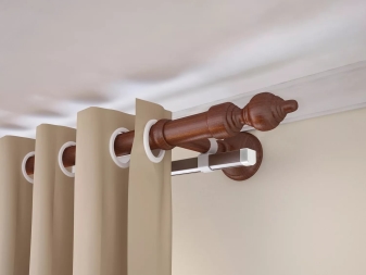 Runde Modelle werden mit speziellen Klammern über dem Fenster befestigt.Sie können sowohl an der Decke als auch an der Wand befestigt werden. Jede Methode hat ihre Vor- und Nachteile. Zum Beispiel, wenn der Raum bereits Spanndecken installiert hat, dann für die Installation des Gesims muss einen Teil der Decke zu demontieren, und dies ist sehr problematisch. Daher ist es in solchen Fällen besser, auf die Option zu setzen, die Struktur an der Wand zu befestigen.