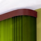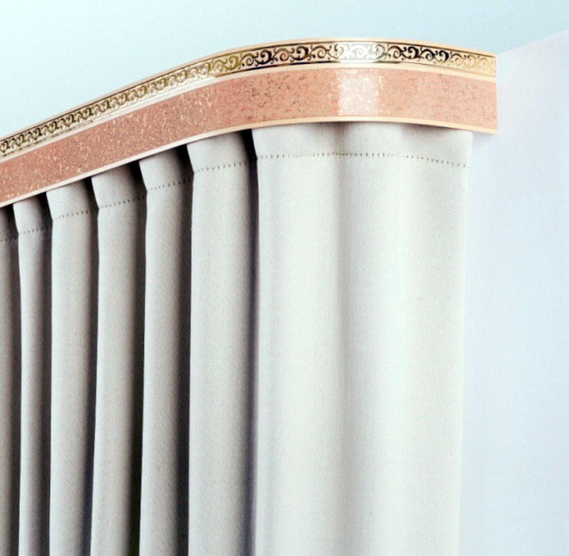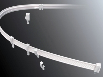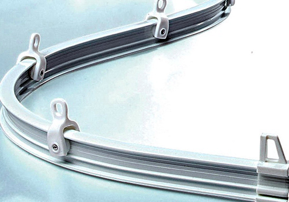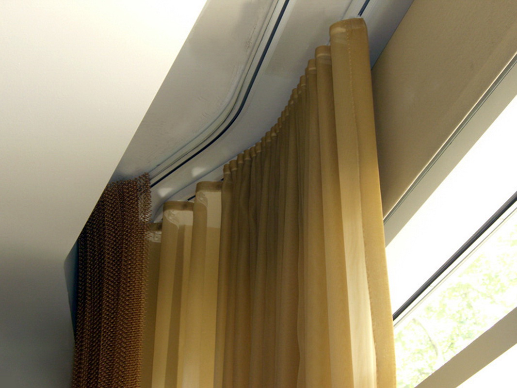 Eine andere Variante sind flexible Vorhangstangen. Sie können aus PVC und aus Aluminium mit einer Polymerbeschichtung bestehen. Sie sind ein dichtes aber plastisches Band, auf dessen Oberfläche sich Läufer mit Haken befinden. Das Band kann aufgrund von Löchern, Federklammern oder Klammern (Aluminiumprofilen) an der Decke befestigt werden.Solche Vorrichtungen sind sehr praktisch für die Gestaltung von Erkerfenstern oder Balkonprojektionen komplexer Konfiguration. Sie können mit einem Schnurkontrollsystem ausgestattet werden.