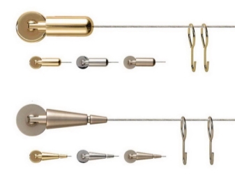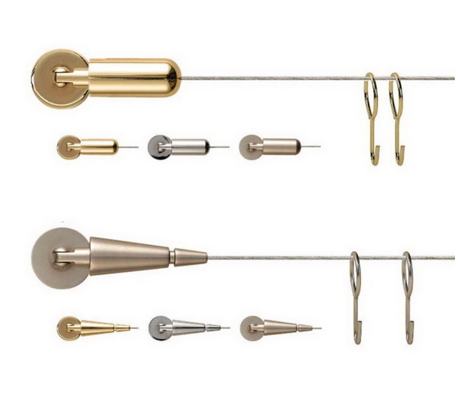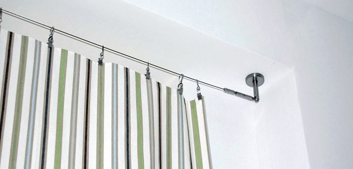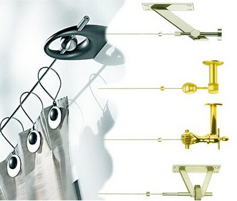 Eine andere Art von Gesims an den Klammern - Schnur - kann sowohl an den Wänden als auch an der Decke montiert werden. Dies sind versteckte Gesimse, die aus einer haltbaren Metallschnur gemacht sind, fast unsichtbar vor dem Hintergrund der Vorhänge. Der Beobachter kann nur zwei Klammern sehen, an denen die Schnur befestigt ist, wodurch das Gefühl entsteht, dass Materie in der Luft schwebt und keine sichtbare Unterstützung hat. An einer solchen Schnur können nur sehr leichte Vorhänge oder Lufttüll aufgehängt werden. In diesem Fall wird das Gesims selbst nicht sichtbar sein, da die Schnur sehr dünn ist, ist sie in den Falten der Vorhänge verloren. Solche Saiten können entweder an zwei Ecken an den Kanten aufgehängt werden oder mit einem dritten Stützzentrum gegen Durchhängen gesichert werden.