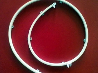 Um das Deckengesims zu installieren, sollten möglichst viele verschiedene Optionen in den Salons berücksichtigt werden. Ein erschwinglicher und preisgünstigster Typ ist ein Kunststoffgesims in Form eines platten Reifens, bei dem es sich um ein PVC-Profil handelt, das in dem unteren Hohlraum, in dem die Haken bewegt werden, Einschnitte aufweist. Dieser Reifen wird mit Schrauben an der Decke befestigt. Sie ist normalerweise mit Drehelementen ausgestattet, die es erlauben, die abgerundeten Enden der Traufe zu zeichnen.