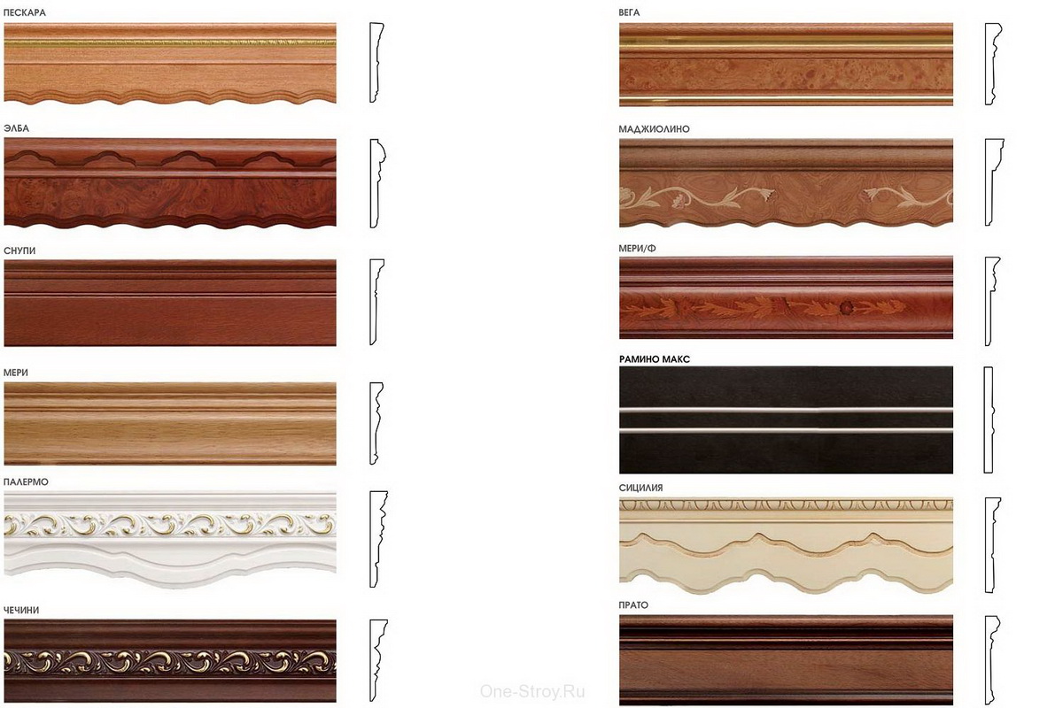 Holzdeckengesimse haben nicht nur funktionale Qualitäten, sondern haben auch ausgezeichnete dekorative Eigenschaften, weshalb sie auch Baguette genannt werden. In den meisten Fällen handelt es sich um Streifen unterschiedlicher Breite. Ihr innerer Teil hat Rillen, in denen sich die Haken befinden, und der äußere Teil ist mit Ornamenten, Überzügen oder Einlagen aus Glas verziert. Die Enden sind oft abgerundet oder abgewinkelt. Die erfolgreichsten Varianten solcher Baguettes sind mit Kunstwerken vergleichbar.