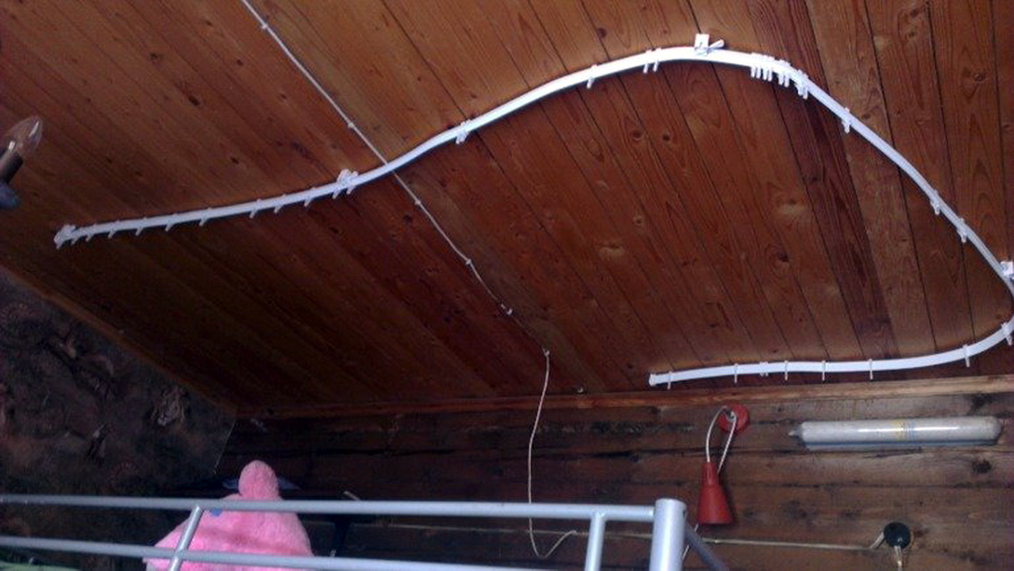 - Auf der Halterung hängen Traufenrohre mit Vorhängen, beispielsweise auf der Tülle; Haken mit Vorhang und Stopfen werden in die Kunststoffschiene eingesteckt, Sie können auch das Baguetteband kleben.
