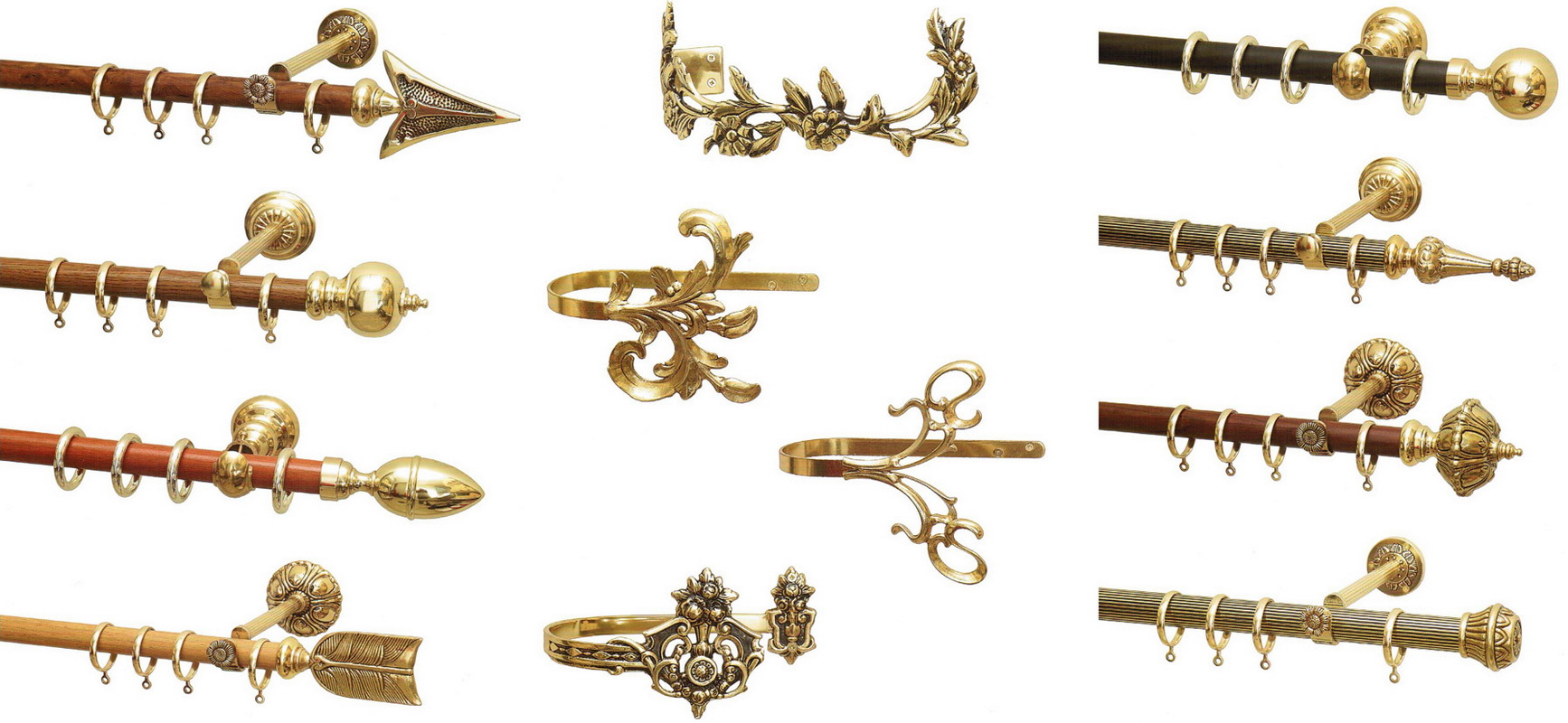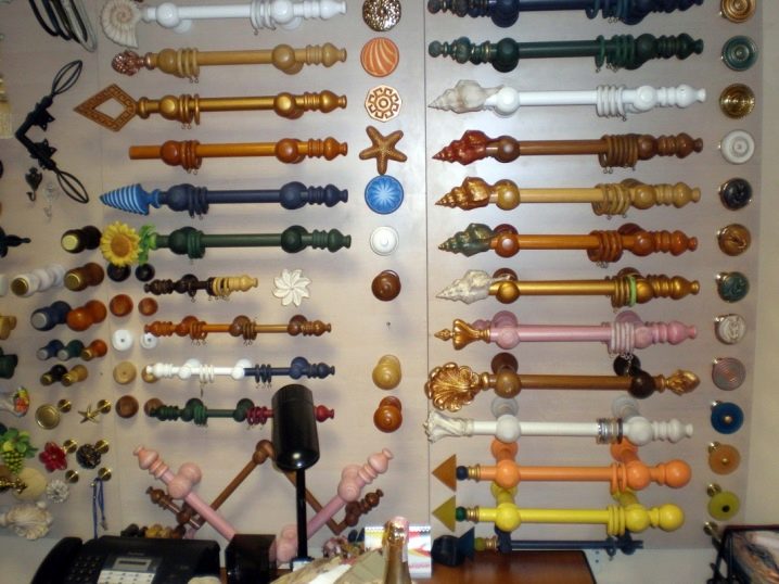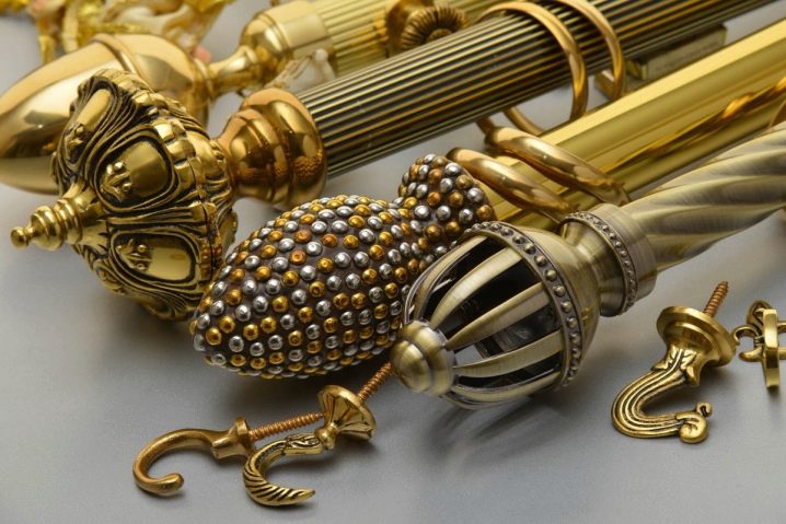Die Enden der Metalltraufen müssen geschlossen sein, wobei entweder normale Kunststoffkappen oder dekorative Spitzen verwendet werden. Die Form der Spitzen kann absolut beliebig sein, von bescheidenen Blättern bis hin zu funkelnden Glaskugeln.Mit Ringösen oder dekorativen Wäscheklammern können Sie Gardinen auf einer solchen Leiste aufhängen. Die hölzernen Traufen werden normalerweise mit einem Satz von Ringen geliefert, in die Wäscheklammern für die Befestigung von Vorhängen eingefügt werden.