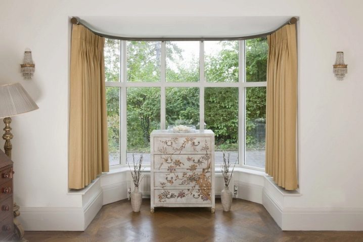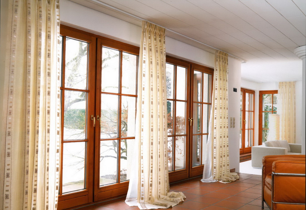 Besonders effektiv sehen sie in hohen Aperturen in einer nicht standardisierten Planung aus, wie beispielsweise die französischen Fenster. Es ist möglich, auf diese Weise nicht nur Fenster, sondern auch Innenbögen oder Türöffnungen zu dekorieren. Mehrere solcher Traufe, die in Serie installiert sind, werden die komplizierte Fensteröffnung des Erkerfensters in einem geometrischen Stil schmücken. Das Material ist in der Regel Aluminium oder Messing, in seltenen Fällen, Schmiedearbeiten an der Decke, geschmiedete Metallstrukturen von geringer Dicke verwendet werden. Besonders attraktiv sind Vorhänge mit Ösen an solchen Traufen. Gewöhnlich wird ein Rohr oder eine Stange montiert, aber das gleichzeitige Vorhandensein von zwei Stangen an einer Halterung ist ebenfalls möglich. Es gibt verschiedene Arten von Gardinenstangen aus Metall, die gleichzeitig Hebe- und Schiebevorhänge tragen können, zum Beispiel einen römischen Vorhang und einen klassischen Lambrequin.