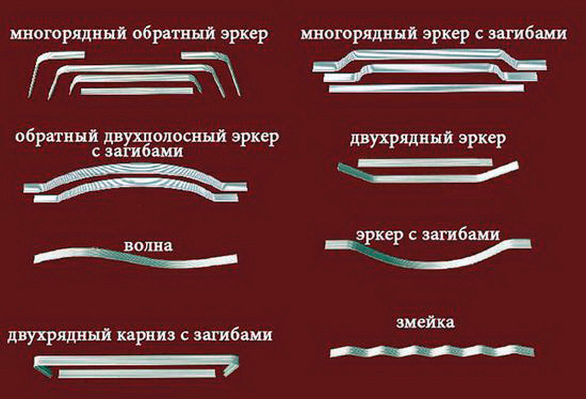- Hohe Tragfähigkeit. Dies sind die zuverlässigsten Designs für hängende Volumen und schwere Vorhänge;