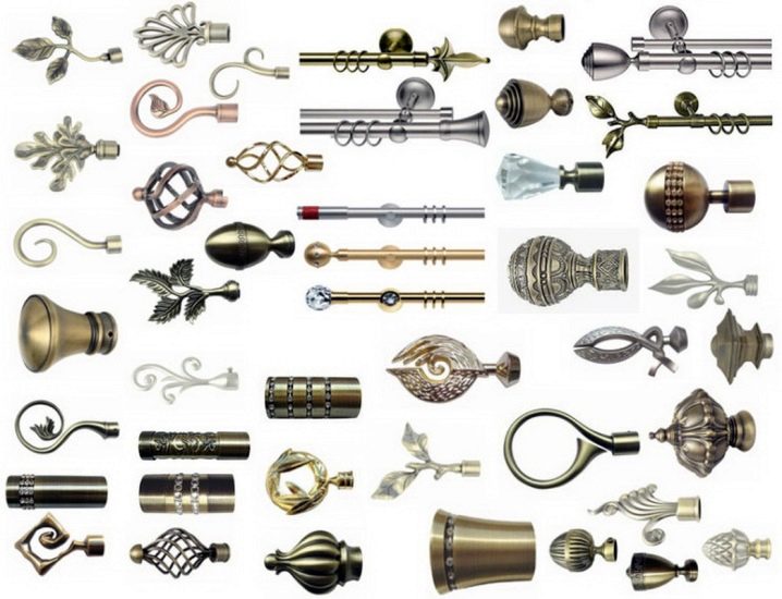Für die Installation und Gestaltung der Traufe sind verschiedene Armaturen erforderlich. Je nach Art und Material können dies Armlehnen, Druckknöpfe und Zubehör in Form von Spitzen, Haltern oder Pickups sein.Für Kunststoffreifen sind Drehelemente vorgesehen, mit denen auch die Enden gestaltet werden können. Vorhänge können an einem solchen Gesims unter Verwendung von gewöhnlichen Kunststoffhaken aufgehängt werden, an denen Kunststoffstopfen verwendet werden, um ein Verrutschen zu verhindern. Dekorative Bagetape kann an der Fassade befestigt werden.