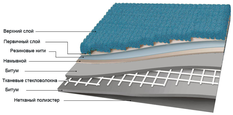 - Durchschnittlich - die Verbindungsschicht, die aus den künstlichen Fasern mit dem Latex besteht, darin sind die Fäden des Pfahls fixiert. Diese Schicht lässt keine Feuchtigkeit absorbieren und absorbiert nicht mehr als 5%. Aufgrund dieser Qualität können Produkte auf Gummibasis unter Bedingungen hoher Feuchtigkeit verwendet werden.