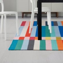 Für moderne Innenräume passen modische fusselfreie Modelle mit hellen Ornamenten und Farben: rosa, blau, oliv, gelb. Besonders interessant ist der Farbteppich, der mehrere leuchtende Farben auf einmal kombiniert.