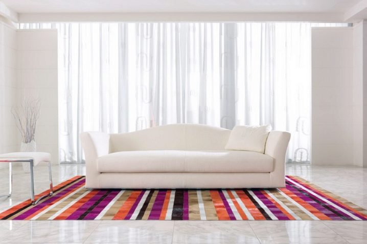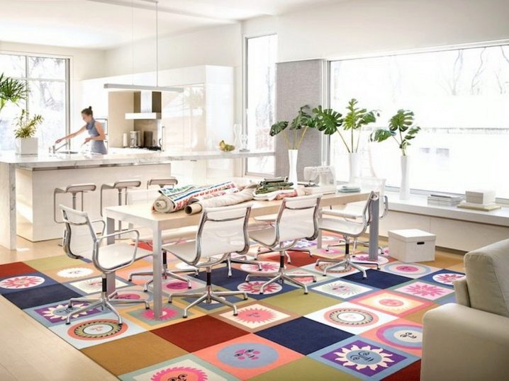 Teppiche jeder Farbe passen zum Raum oder Wohnzimmer - schlicht, ruhig oder mehrfarbig, mit stilvollen Drucken im Stil der Pop Art, wenn dies zum Konzept des gesamten Interieurs passt.