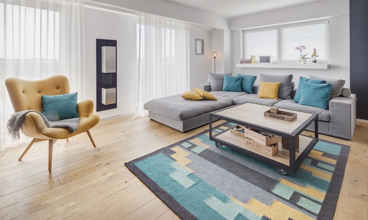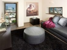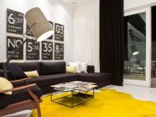 Mittelgroße Teppiche werden in der Mitte des Raumes verlegt. Da der offene Boden noch recht großflächig ist, ist hier das Spiel mit Kontrasten und Kombinationen angebracht, da Ihr Boden und der Bodenbelag gleichzeitig sichtbar sind. Wenn du einen großen Teppich kaufst, kannst du dir nicht zu viele Sorgen machen.