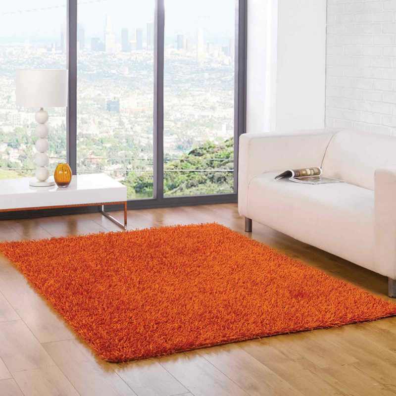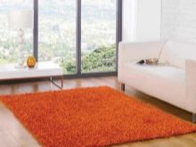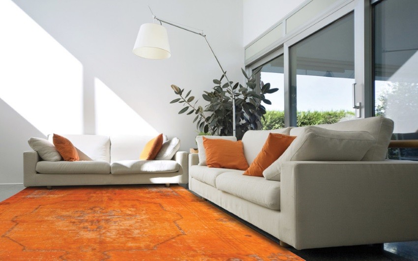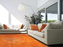 Warme und attraktive Farbe. Orange Teppiche können in reservierten Ziegelsteintönen sein und können einen saftigen orange Farbton haben. Im Gegensatz zu Blau erwärmt diese Farbe den Raum. Es ist ratsam, ein solches Produkt in einem Raum zu verlegen, in dem die Wände und der Boden einen kalten Farbton haben, so dass die visuelle "Temperatur" nicht zu hoch ist.