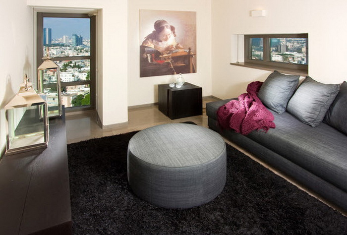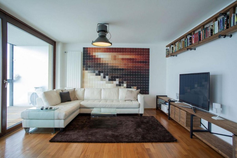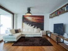 Sehr "warmer" Raum: Der Effekt war auf die korrekte Platzierung der Akzente zurückzuführen. Farbiger Teppich (wenn Sie genau hinsehen,alle Farben des Spektrums sind darauf sichtbar) harmonisiert im Innenraum mit dekorativen Paneelen und anderen hellen "Punkten" - Vase, Kissen. Die Farben des Bodens und des Sofas sind ebenfalls warm. All dies wird durch große Fenster und weiße Wände ausgeglichen. Das Ergebnis war hell, aber angenehm für die Augen.